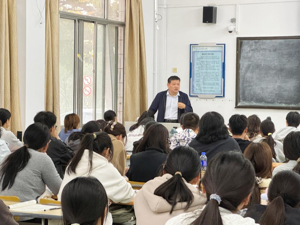 近日,山东政法学院党委委员、副院长蒋海升在笃行楼107教室,为商学院2025级国际经济与贸易专业、金融工程专业新生讲授了一堂主题为“纪念抗战胜利,坚定民族信念”的形势与政策课。